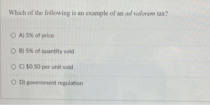Which Of The Following Is An Example Of An Ad Valorem Chegg Com